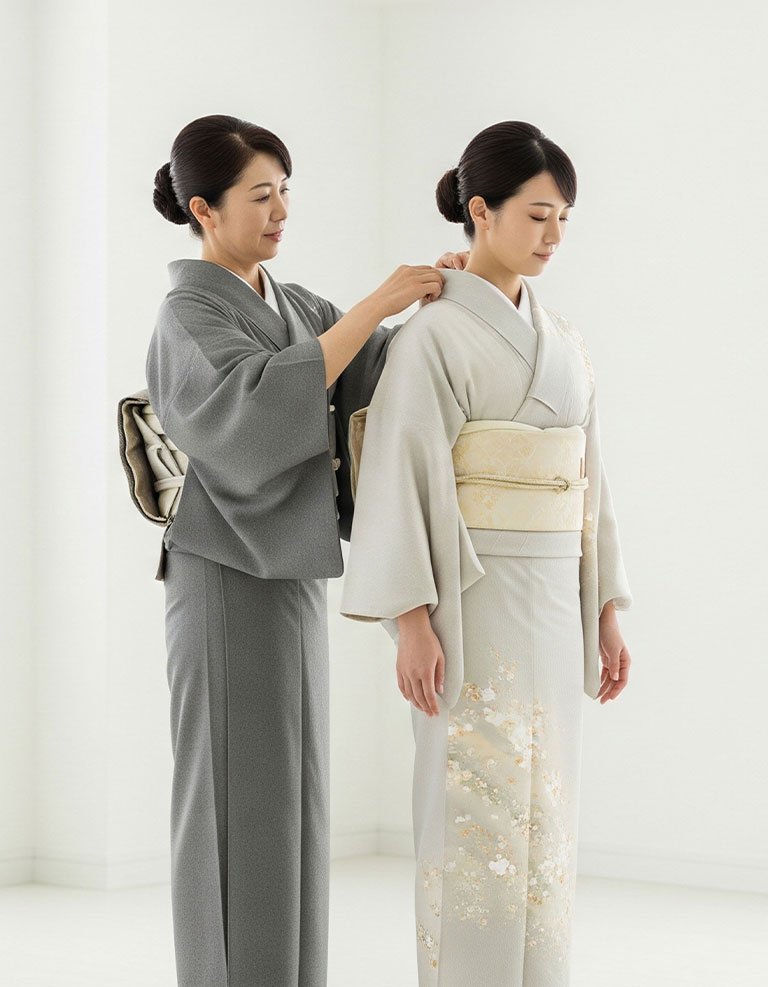 落ち着いた雰囲気の中で、ゆっくりと着付けの基礎を身につけていただけるグループレッスンです。